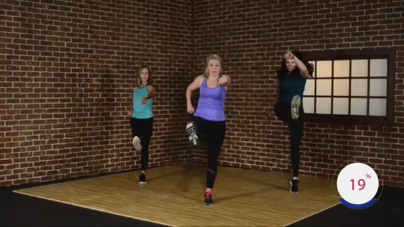 This marching aerobics class is a pretty light workout from Jenny. Though her marching workouts are not generally strenuous, I felt this one to be particularly mild. There are some high impact moves in the cardio bursts, but even if you don’t modify them to low impact, you’ll only break out a gentle sweat. I actually felt like my mom, who is in her 60s, could easily do this workout!