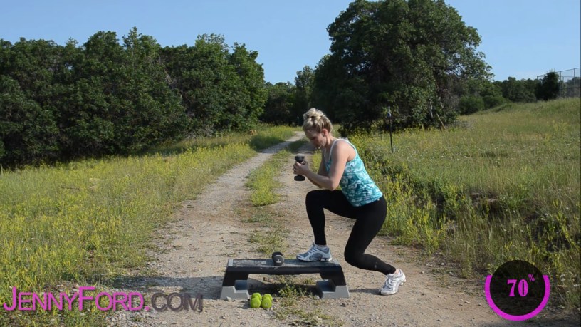 The step bench is optional here, but without it, you won’t get the same kind of workout. She also doesn’t really explain what to do if you don’t have a step bench, but you can opt to do regular lunges instead of using a step bench; that’s what I did, and it still burned like crazy with the weights!