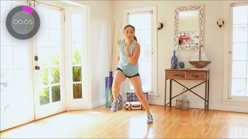 This is a pretty intense cardio routine. Don’t try to use this short workout to warm up, because it jumps right into hard moves, right off the bat! There are a lot of jumping and high impact moves so you will definitely be out of breath after just one round.